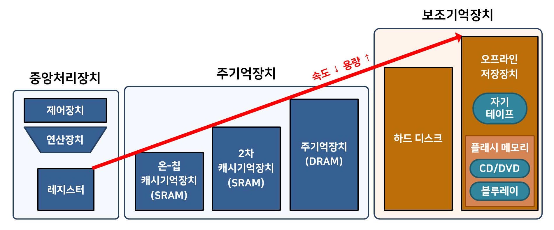 주기억장치에서 불러오는 정보가 있는 장치. 가격이 저렴하고 많은 양의 데이터를 저장할 수 있지만 동작 속도가 느리다.