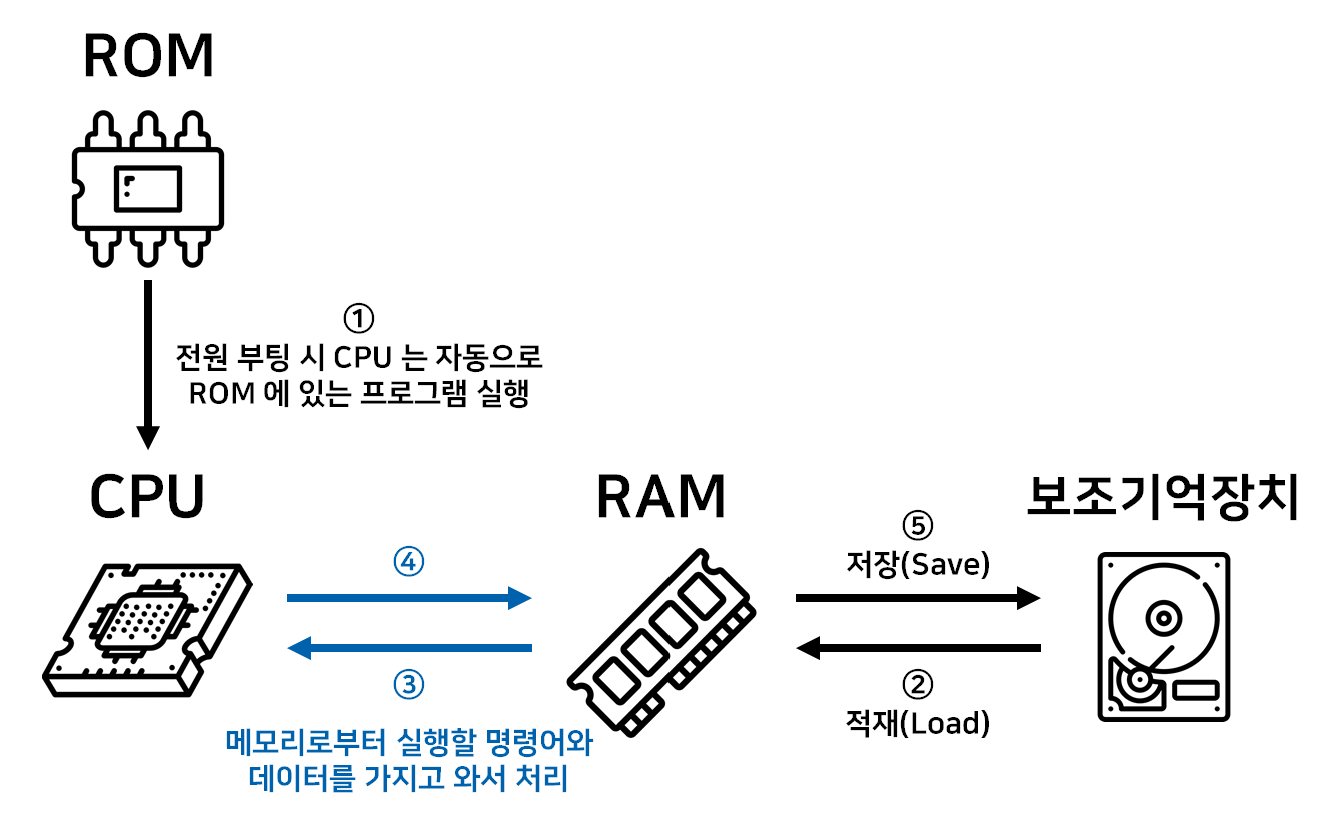- ROM 바이오스에 의해 하드디스크의 운영체제를 불러오는 부팅과정에 사용됨