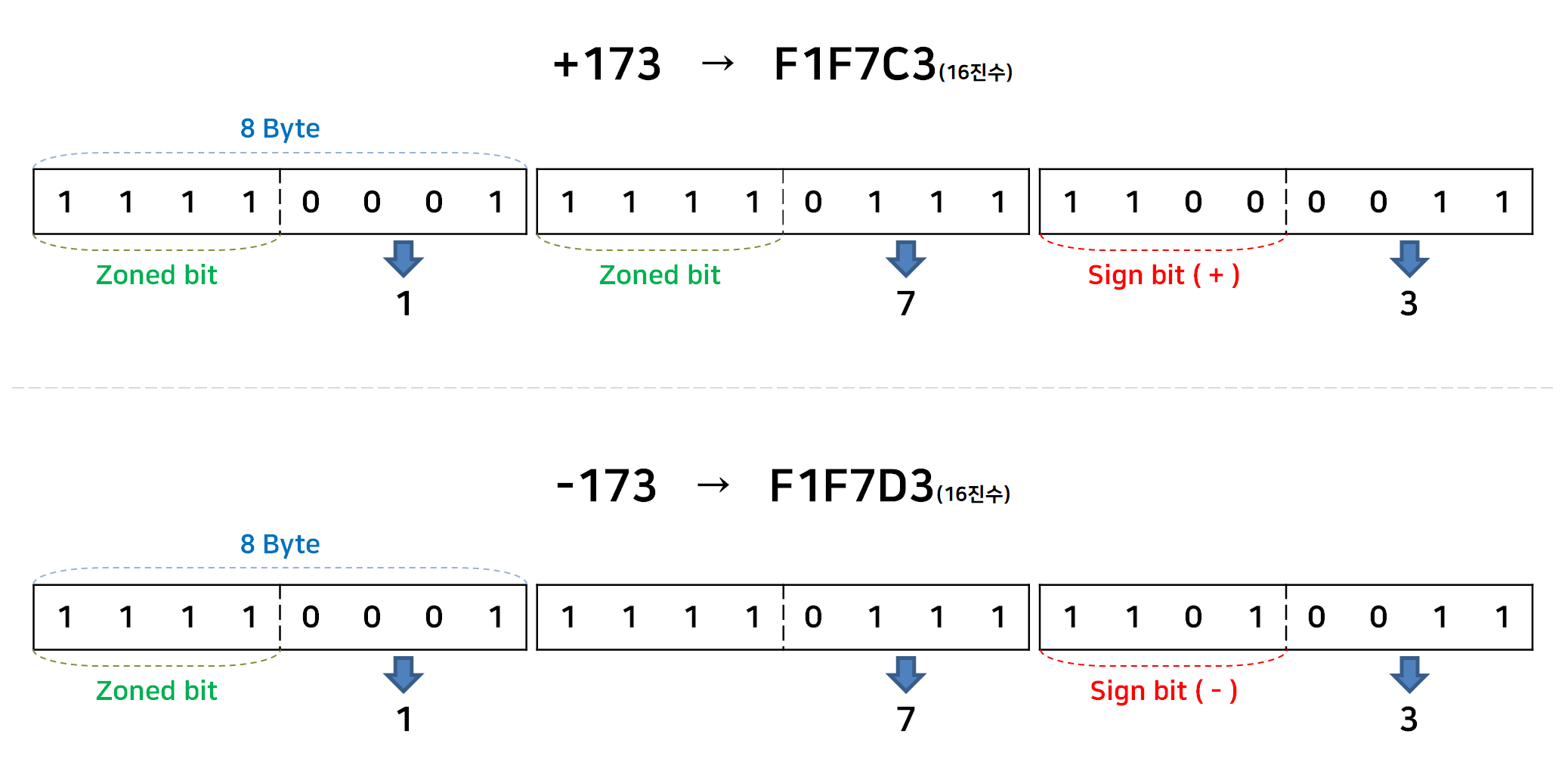 앞의 4 bit 는 Zoned bit 와 Sign bit 두 가지 역할을 가지는데, 마지막 숫자를 나타낼 때 사용되는 앞의 4 bit 만이 Sign bit 로 사용된다.