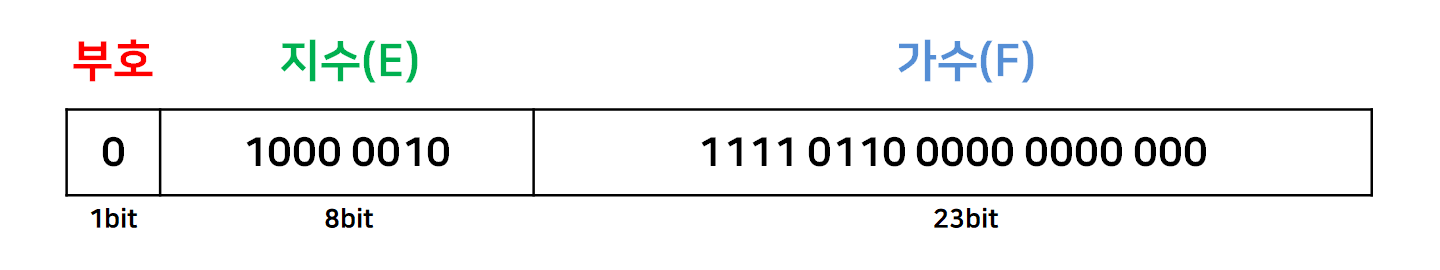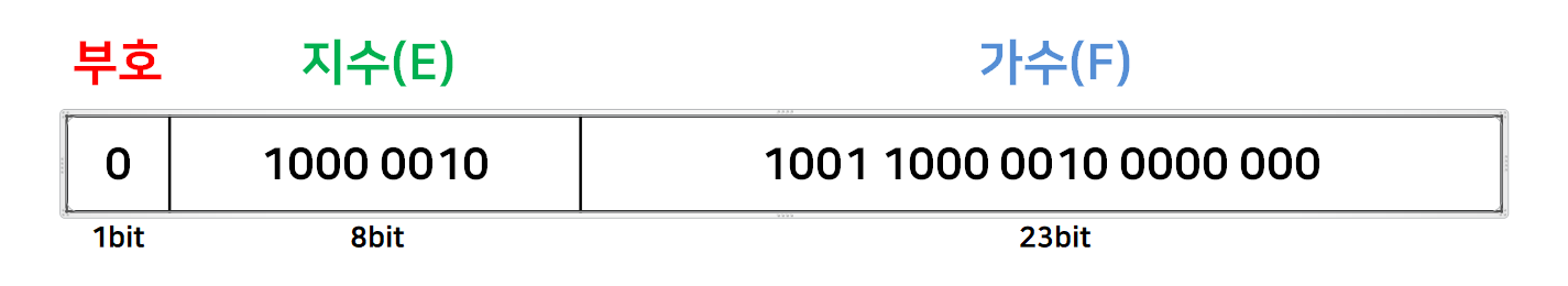 지수부에 저장된 값은 실제 지수값이 아닌 편향값인 127을 더한 값이 저장된다. 따라서 위 예시의 실제 지수값은 저장된 값에 편향값인 127을 뺀 값이다.