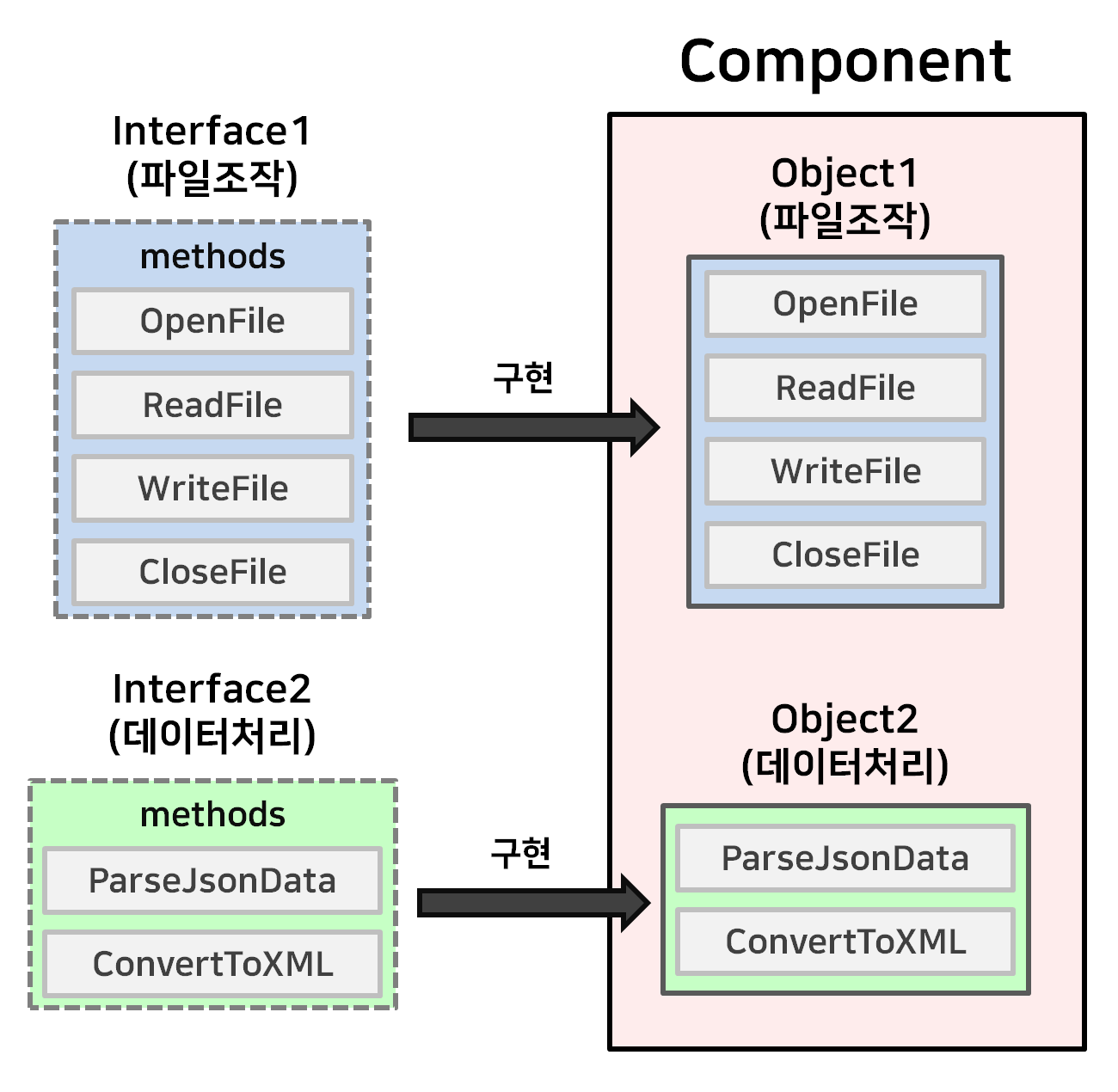 이러한 경우, 파일 조작에 관련된 interface 와 데이터 처리에 관련된 interface 를 각각 작성할 수 있다. 각 interface 는 object 로서 실제 기능이 구현되고, 구현된 object 들을 포함하는 component 가 만들어지는 것이다.