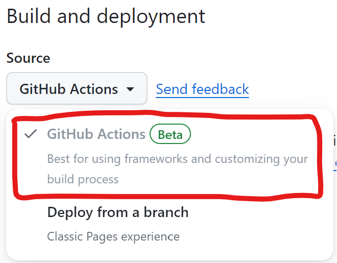 Build and Deployment를 찾아간 후,Source항목의 값을Github Actions로 변경한다.