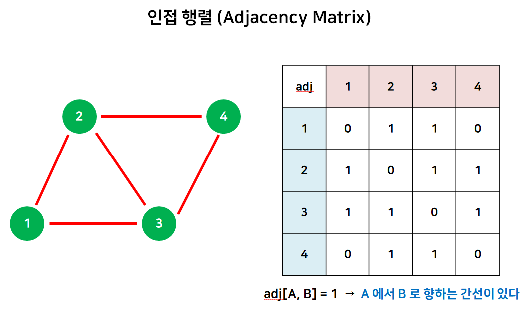 int[][] adj = int new[V][V];형태로 구현한다.- 인접행렬을 만드는데 $O(V^2)$ 만큼의 공간이 필요하다. 이는 정점이 많아질수록 어마어마한 공간을 필요로 한다는 뜻이다.