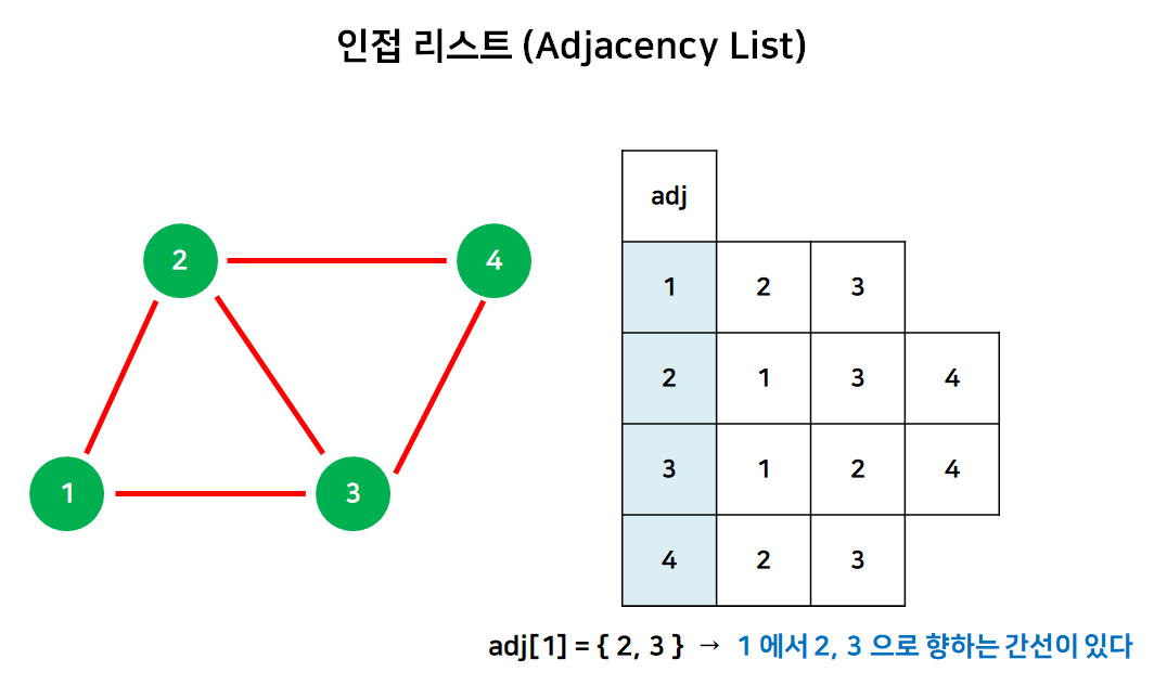 ArrayList<Integer>[] adj;형태로 구현한다.- $O(E)$ 만큼의 공간이 필요하다.(차수 만큼의 공간이 필요하며, 이는 2E 이나 상수항은 생략) 이는 인접 행렬에 비해 훨씬 효율적이다.