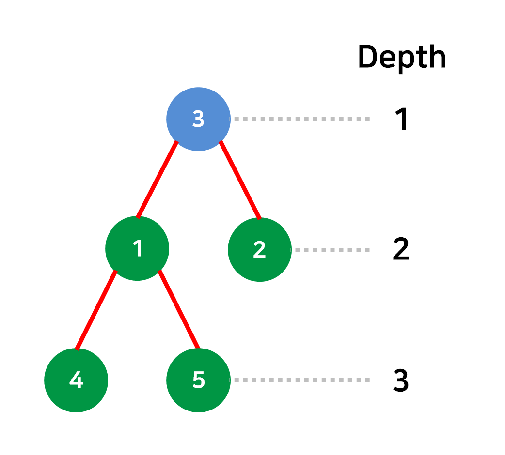 - Depth : Root 노드로부터의 거리를 나타내기 위한 상대적인 깊이 개념이다. 보통 Root 노드의 Depth 를 0 또는 1 로 설정하고, 다음 노드부터 1 씩 늘어난다.