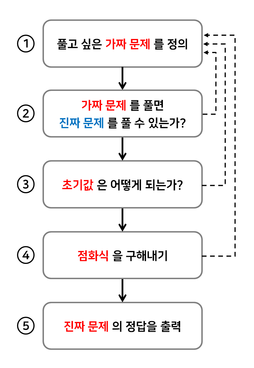 진짜 문제를 풀 수 없는 경우, 다시 1번으로 돌아가서 가짜 문제를 정의한다.
