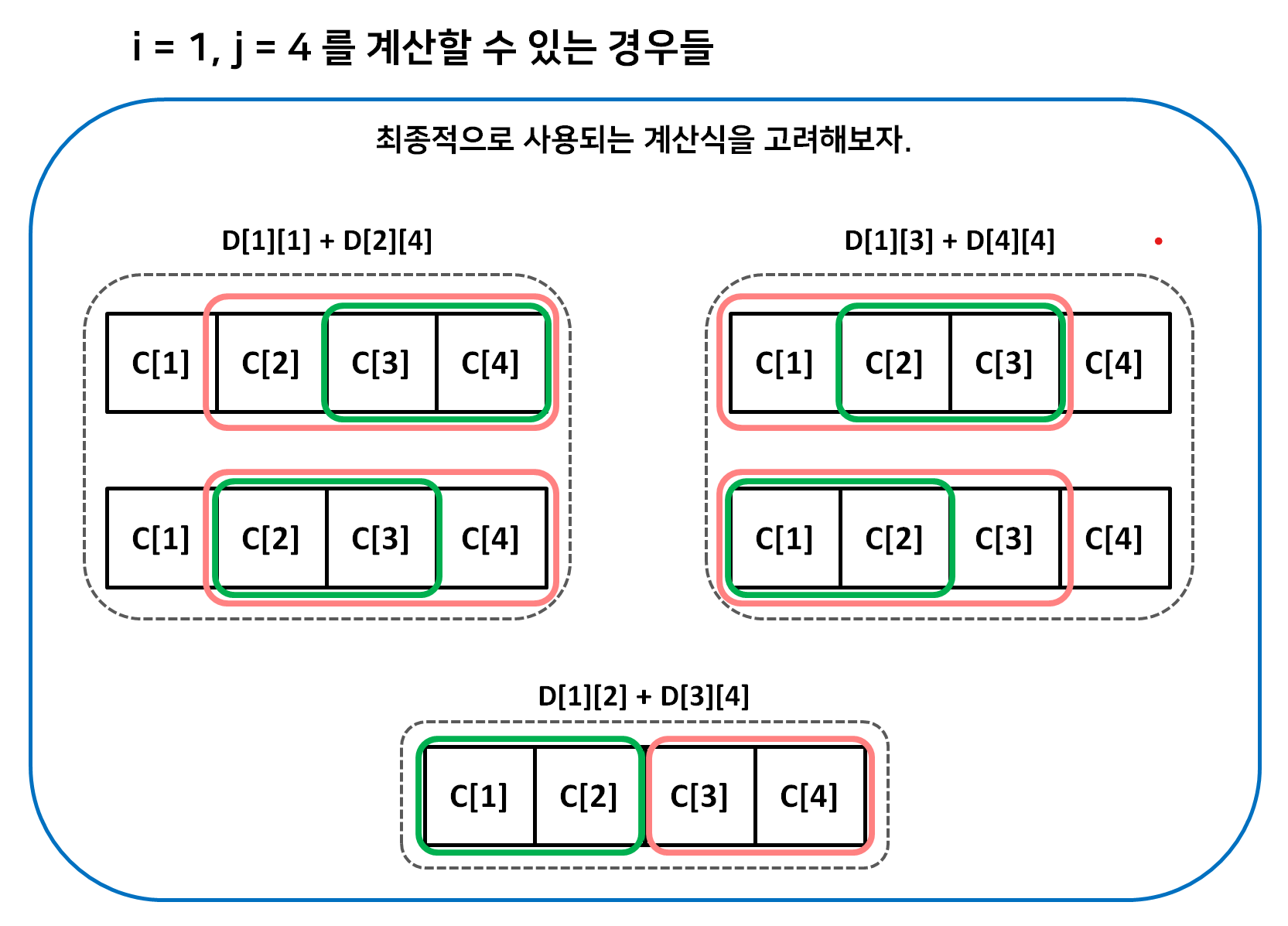 \[Dy[i][j] = \displaystyle\min_{i \le x \le j} \lbrace Dy[i][x] + Dy[x + 1][j] \rbrace + \displaystyle\sum_{y=i}^j C[y]\]파티션의 최소 비용을 찾은 후에, 최종적으로 합쳐질 때의 가산 비용인 전체 파일의 크기 합을 더해준다.