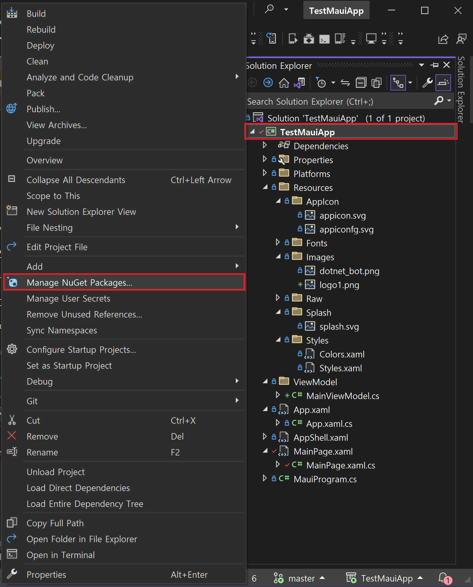 Solution Explorer 에서 프로젝트를 우클릭하고 Manage Nuget Packages 를 선택하자.